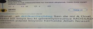 Üstelik Uşaklı hoca olarak bilinen Zaman gazetesi yazarı Ali ÜNAL’ın, terör elebaşı Fetullah’ın “Doğruluk ve Hak istikametindeki her hareketi alkışlamak Hakka karşı saygılı olmanın ifadesidir.” şeklindeki beyanını paylaşması üzerine 7 Haziran 2014 tarihinde, aşağıda görüldüğü üzere, zeyt4 isimli müstear tivitır hesabımdan “Sen de mi Ali ÜNAL, nasıl bir büyü bu ki göremiyorsunuz. MOSSAD destekli papaz büyüsü Allah feraset versin” paylaşımını yaparak eleştirmişim