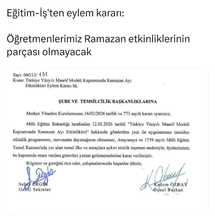 Eğitim-İş tarafından yayımlanan resmi yazıda, okullarda Ramazan ayı boyunca yapılması planlanan dini ve kültürel etkinliklerin “mevzuata aykırı” olduğu iddia edildi. Ancak kamuoyu bu bahaneyi yabancı bulmuyor. Ne zaman milletin inanç değerleri, gelenekleri ve bin yıllık kültürü eğitim sisteminde kendine yer bulsa; bu yapıların “Anayasa” ve “laiklik” söylemlerinin arkasına sığınarak maneviyata savaş açması dikkat çekiyor.