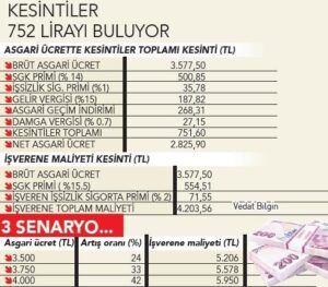 Şu anda asgari ücretten SGK primi, gelir vergisi, damga vergisi ve işsizlik sigortası işçi payı olmak üzere 752 TL kesinti yapılmaktadır. Asgari ücretliden yüzde 15 gelir vergisi ve binde 7.59 oranında damga vergisi kesiliyor. Bu iki vergi için işçinin maaşından yapılan aylık kesinti 214 TL. Taraflar ücretler üzerindeki vergilerin kademeli olarak azaltılmasını istiyor.