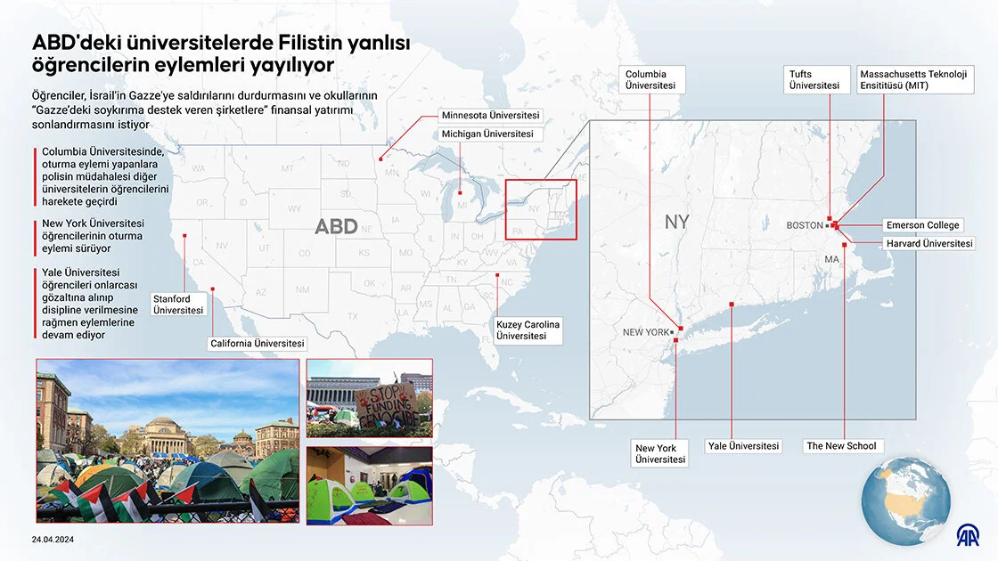 ABD’nin farklı üniversitelerinde başlayan ve hızla yayılan Gazze’ye destek gösterileri, öğrencilerin Filistin halkına verdiği destekle güçleniyor. Columbia, NYU, Stanford, Yale, MIT ve diğer birçok üniversitede düzenlenen eylemler, İsrail’in Gazze’deki saldırılarına karşı bir tepki olarak başladı ve tüm engellemelere rağmen devam ediyor..