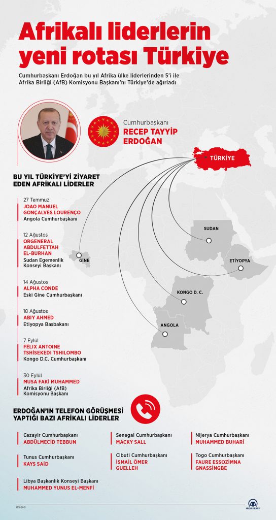 Kongo Demokratik Cumhuriyeti Cumhurbaşkanı Felix Antoine Tshisekedi Tshilombo, Etiyopya Başbakanı Abiy Ahmed, Sudan Egemenlik Konseyi Başkanı Orgeneral Abdulfettah el-Burhan ve Angola Cumhurbaşkanı Joao Manuel Gonçalves Lourenço gibi Afrikalı liderler Türkiye’yi ziyaret ederek, Cumhurbaşkanı Erdoğan ile iki ülke ilişkilerini görüştü.