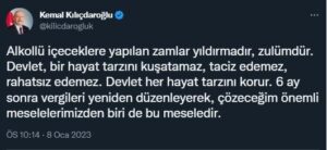 Kemal Kılıçdaroğlu’nun üstelik zammı, yıldırma ve hayat tarzlarına müdahaleci bir zulüm olarak nitelemesi ve alkollü içkilere ulaşımı kolaylaştıracağını vadetmesi gerçekten bir akıl tutulmasıdır. Siyasi bir getirisi de olamaz.