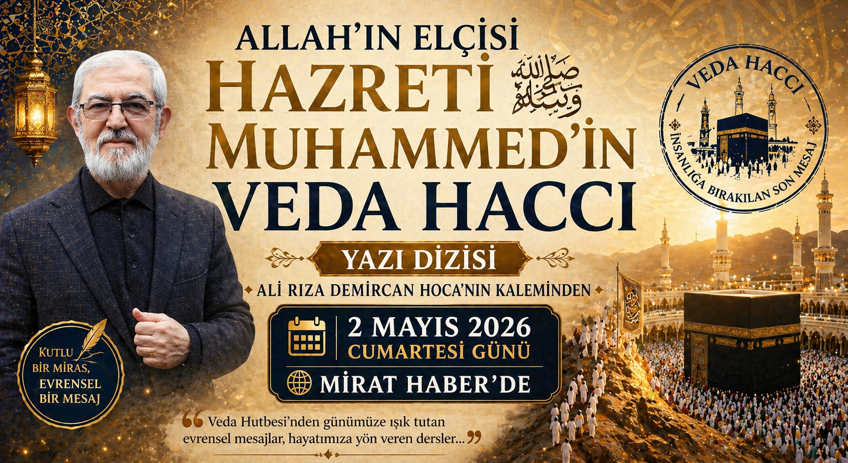 Bu büyük mirası yeniden anlamak ve günümüze taşımak amacıyla, ilahiyatçı-yazar Ali Rıza Demircan Hoca’nın kaleme aldığı “Allah’ın Elçisi Hazreti Muhammed’in Veda Haccı” başlıklı özel yazı dizisi 2 Mayıs 2026 tarihinden itibaren Mirat Haber’de okuyucuyla buluşuyor.