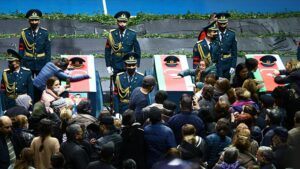 Azerbaycan’da bir askeri helikopterin Karaheybet hava eğitim alanında inişe geçerken kaza yapması sonucunda çoğu rütbeli olan şehit 14 asker için tören yapıldı.