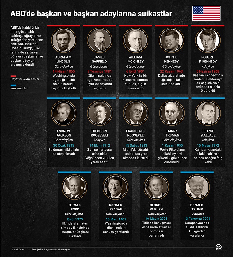 46 ABD Başkanından 15’i Suikasta maruz kalmış ve bunların 5’i hayatını kaybetmiş. Diğer kalan 10’u ise yaralanmış ya da kıl payı ölümden dönmüş…