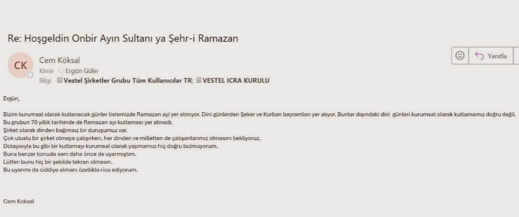 Bizim kurumsal olarak kutlanacak günler listemizde Ramazan ayı yer almıyor. Dini günlerden Şeker ve Kurban bayramları yer alıyor. Bunlar dışındaki dini günleri kurumsal olarak kutlamanız doğru değil. Bu grubun 70 yıllık tarihinde de Ramazan ayı kutlaması yer almadı. Şirket olarak dinden bağımsız bir duruşumuz var. Çok uluslu bir şirket olmaya çalışırken, her dinden ve milletten de çalışanlarımız olmasını bekliyoruz. Dolayısıyla bu gibi bir kutlamayı kurumsal olarak yapmamızı hiç doğru bulmuyorum. Buna benzer konuda seni daha önce de uyarmıştım.”