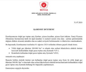 Ağustos ayı için yapılan son açıklamaya göre, Boru Hatları ile Petrol Taşıma AŞ (BOTAŞ), konutlarda kullanılan doğalgaza yüzde 38 oranında zam yapıldığını duyurdu. Bu artış, 1 Ağustos itibariyle yürürlüğe girecek.