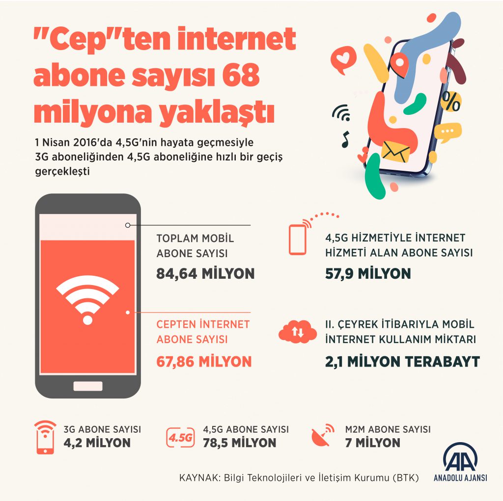 Türkiye’de 3G ve 4,5G hizmetiyle mobil bilgisayardan ve cepten internet hizmeti alan mobil geniş bant abone sayısı 67 milyon 857 bin 214’e ulaştı.