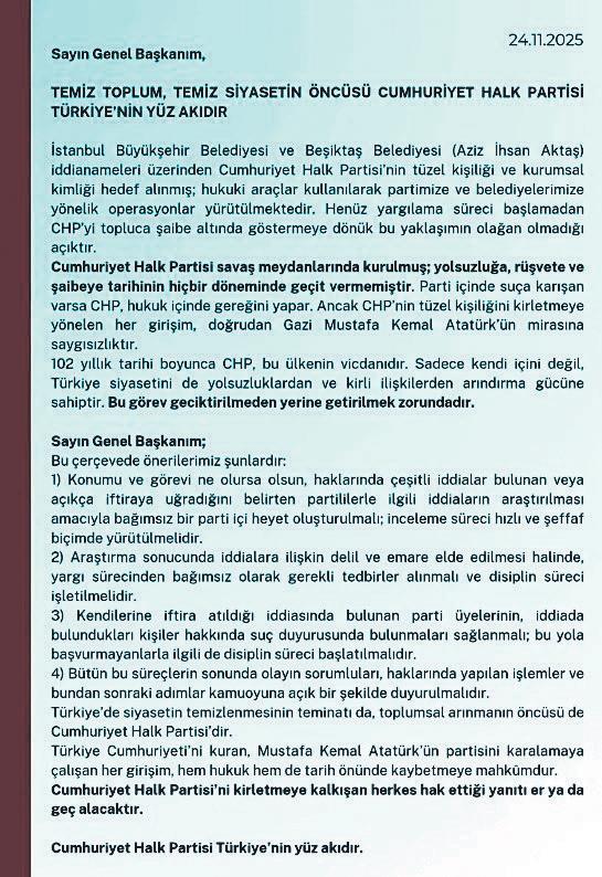 “Temiz toplum, temiz siyasetin öncüsü Cumhuriyet Halk Partisi, Türkiye’nin yüz akıdır” diye başlayan bildiride, İBB ve Beşiktaş Belediyesi (Aziz İhsan Aktaş iddianameleri) üzerinden partinin kurumsal kimliğinin hedef alındığı vurgulandı. Eski vekiller, hukuki araçların kullanılarak yürütülen operasyonların CHP’yi karalamaya yönelik olduğunu savunarak, “Sadece kendi içini değil, Türkiye siyasetini de yolsuzluklardan ve kirli ilişkilerden arındırma gücüne sahiptir. Bu görev geciktirilmeden yerine getirilmek zorundadır” ifadelerini kullandı.