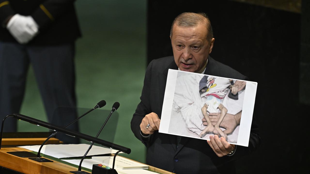 Ardından, açlıktan ölme noktasına gelen bir çocuğun fotoğrafını gösteren Erdoğan, “Buna hangi vicdan dayanır, hangi vicdan buna sessiz kalabilir? Çocukların açlıktan, ilaçsızlıktan öldüğü bir dünyada huzur olur mu?” ifadesini kullandı.