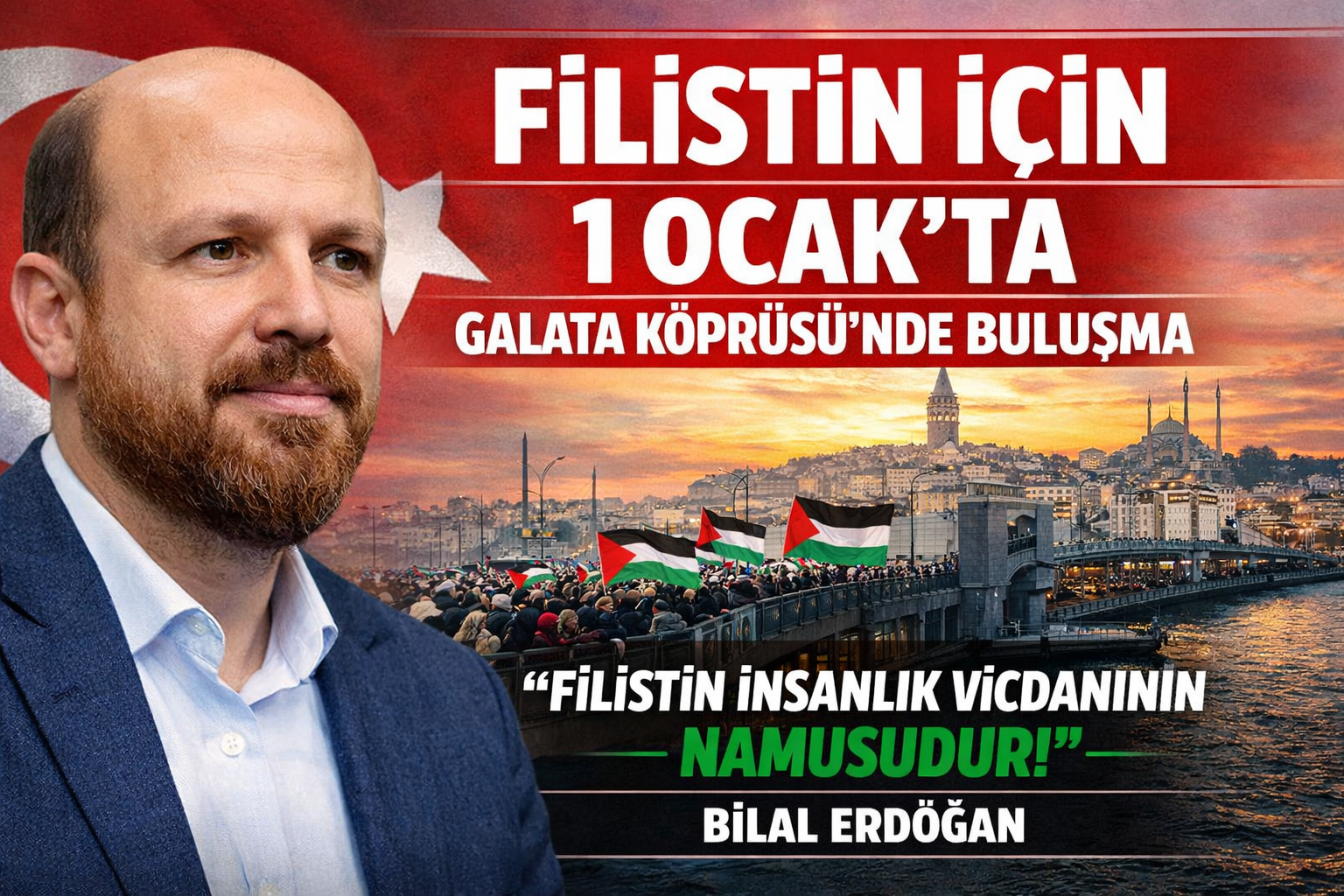 Dünya Etnospor Konfederasyonu Başkanı Bilal Erdoğan, Filistin meselesinin insanlık vicdanının ve ümmetin namusu olduğunu vurgulayarak, 1 Ocak sabahı Galata Köprüsü’nde Filistin ve Kudüs için bir araya gelineceğini açıkladı.