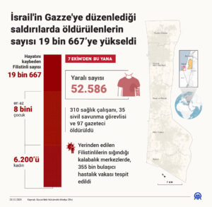 Gazze Şeridi’nde çatışmalar devam ediyor. Çatışmalar son 24 saat içinde daha da derinleşerek toplam can kaybını 19 bin 667’ye çıkardı. İsrail’in saldırıları, Gazze’deki sivil altyapıyı hedef alırken, sağlık sektörü de çökmüş durumda.