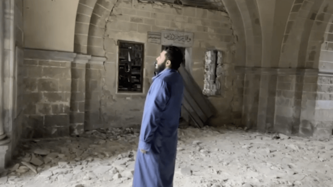 “Memlük ve Osmanlı mimarisinin özelliklerini taşıyan tarihi ‘Büyük Ömer camii’ yıktlar. Ama Allah’ın adının semalara yükselmesini, Siyonistler engelleyemedi” diye haykırıyor Gazzeli imam…