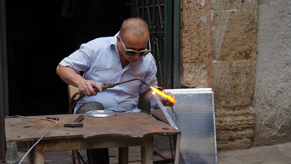 Küçükpazar’da Arnavut kaldırımı taşlarında yürürken tarihi Ali Paşa Han‘a yaklaştıkça önce çekiç sesleri duyuluyor.