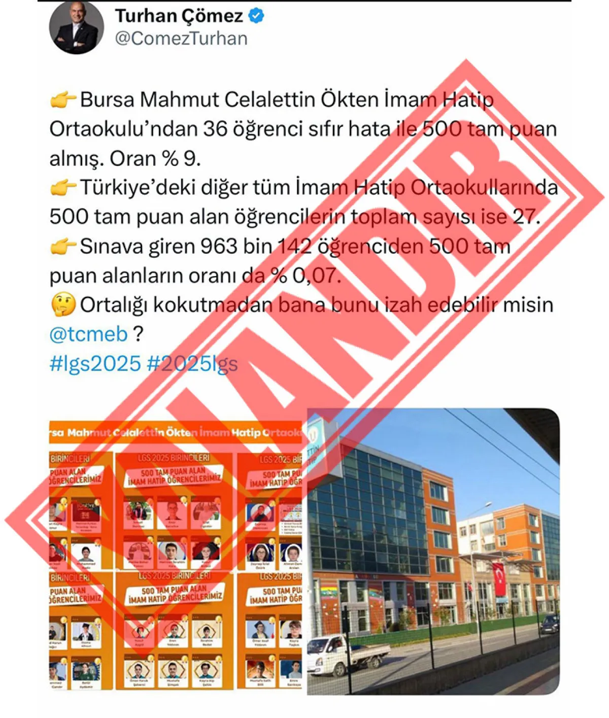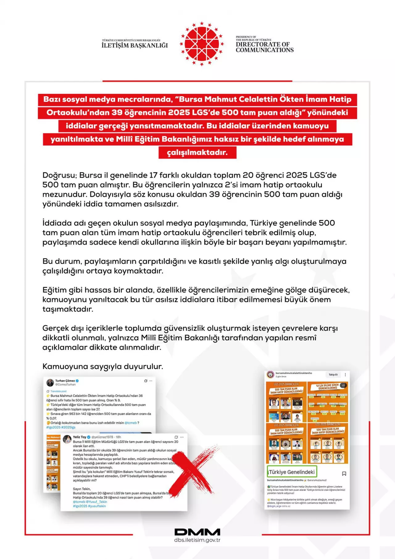 Bursa Mahmut Celalettin Ökten İmam Hatip Ortaokulu’ndan 39 öğrencinin 500 tam puan aldığı yönündeki iddianın tamamen asılsız olduğu vurgulanan bilgilendirmede, Çömez’in kasıtlı olarak yanlış algı oluşturduğu kaydedildi.
