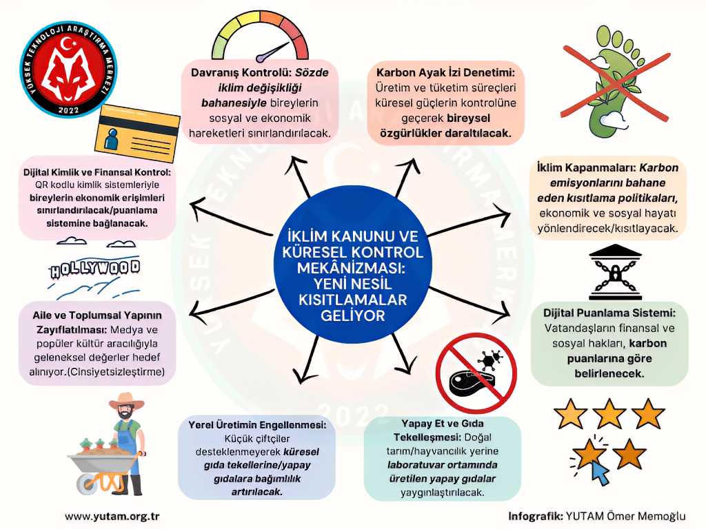 İklim Kanunu özünde sözde iklim değişikliği adı altında insanlığa dayatılan yeni kısıtlamaların geliyor olduğunun bir göstergesi/habercisidir ve özgürlüklerimize yönelik ciddi tehditler barındırmaktadır. Bu kanun ile hedef, iklim kapanmalarına giden sürece zemin/dayanak oluşturmaktır. Karbon ayak izi uygulamalarıyla/ölçüm sistemleri ile dünyadaki tüm üretim ve tüketim süreçlerini kontrol altına almak isteyen küresel güçler, politik baskılarla ülkelerde bu zemini oluşturabilmek adına harekete geçti. Sözde dünyayı kurtarmak için harekete geçildiği izlenimi veren iklim değişikliği özünde büyük bir kısıtlama düzeninin inşa edilmesi sürecidir. Ortada bir iklim krizi yoktur. Ortada iklimi bahane ederek insan davranışlarına sosyal ve ekonomik yönde şekil verilmek istenmesi, dijital kimlikler ile bu sürecin takip edilmesi, sisteme (kontrol düzenine) muhalif olan bireylerin ise cezalandırılması planı vardır.