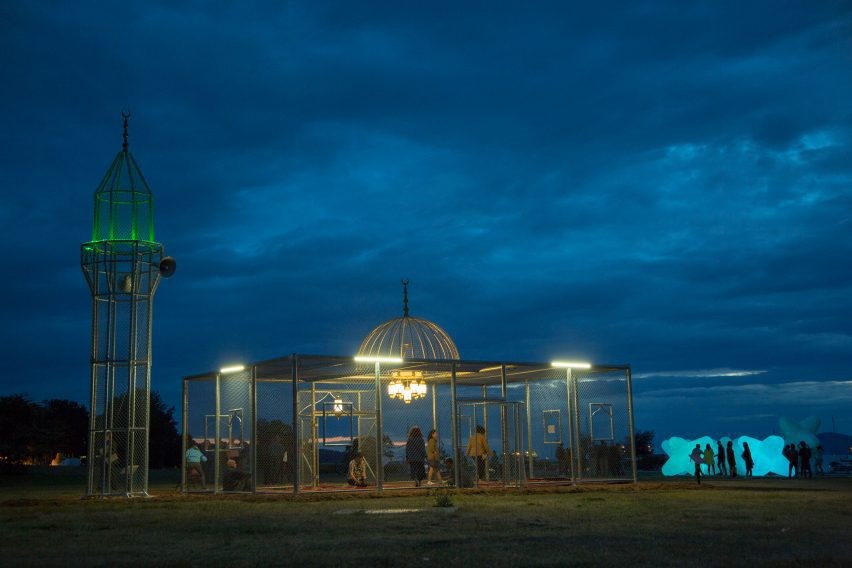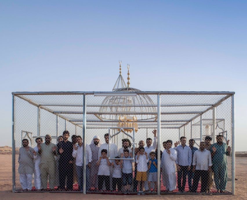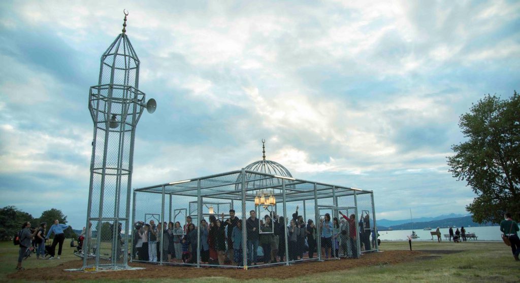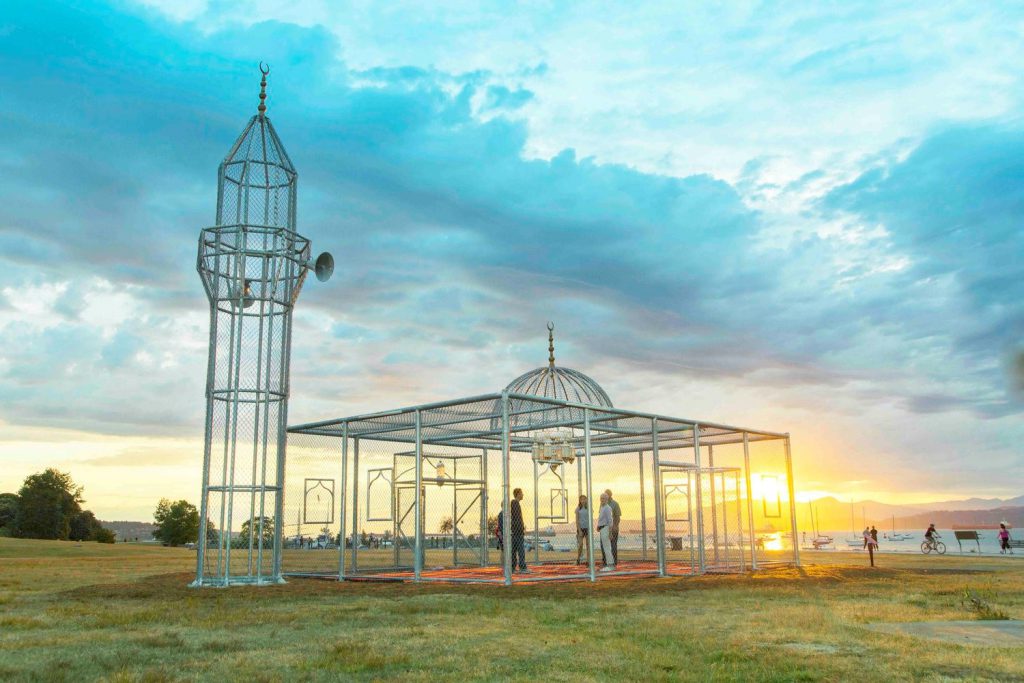 Suudi Arabistanlı sanatçı Ajlan Gharem’in V&A’s Jameel Ödülü’ne layık görülen “Paradise Has Many Gates” ( Cennetin Birçok Kapısı Var ) enstalasyonunda, geleneksel cami tipolojisi çit benzeri çelik telle yeniden tasarlanmıştır.