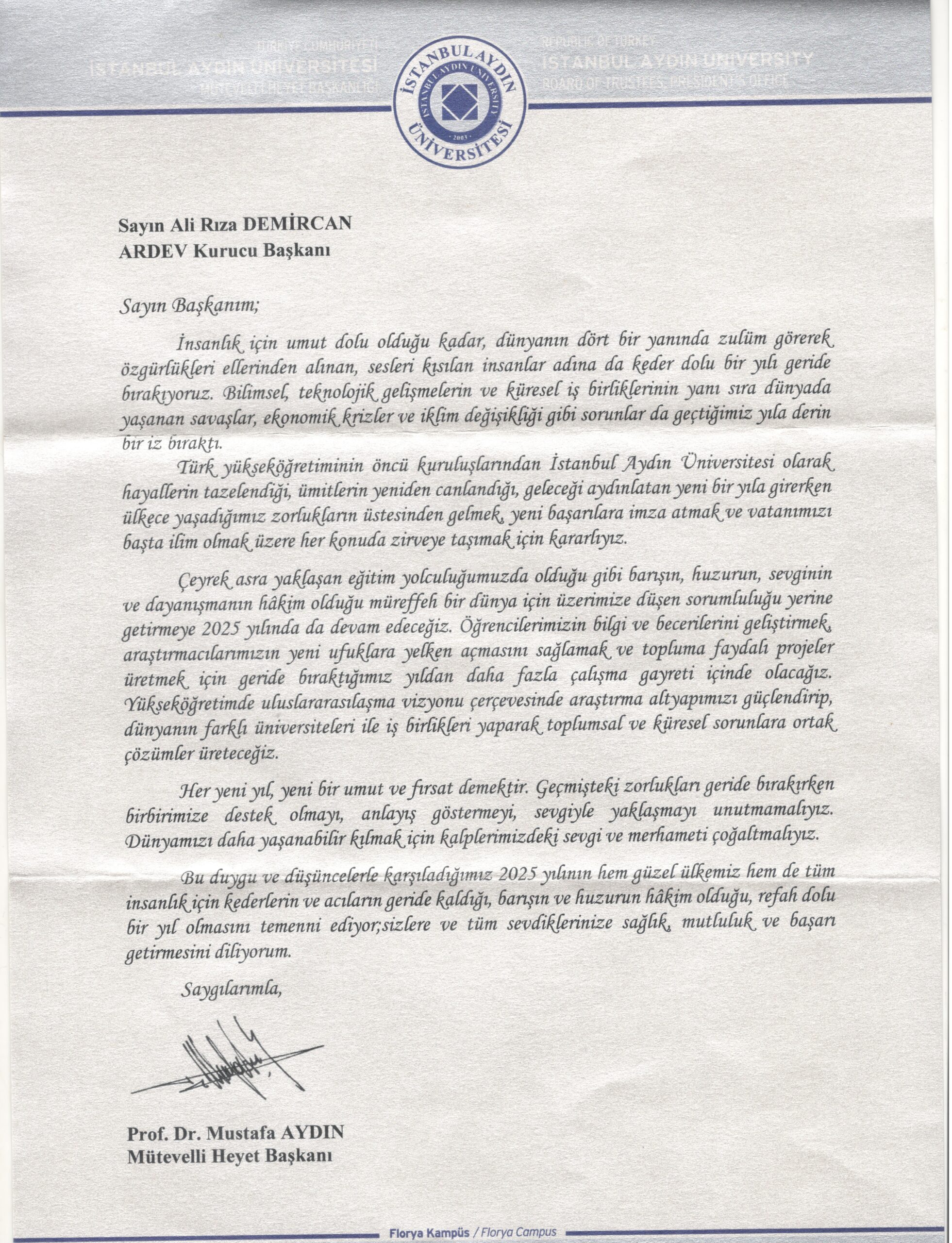 İstanbul Aydın Üniversitesi Mütevelli Heyet Başkanı Prof. Dr. Mustafa Aydın, yeni yıl vesilesiyle ARDEV Vakfı’na gönderdiği mesajında, Ali Rıza Demircan Hocamız şahsında vakfa hitap etti. Mesajında birçok önemli konuya değinen Prof. Dr. Aydın, vakfın çalışmalarına başarı dileklerini iletti.