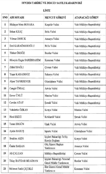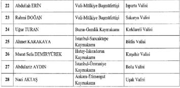 Kararname ile Hüdayar Mete Buhara, Erkan Kılıç, Yılmaz Doruk, Erol Karaömeroğlu, Türker Öksüz, Hüseyin Engin Sarıibrahim, Zülkif Dağlı, Yaşar Karadeniz, Alper Tanrısever, Cengiz Ünsal, Enver Ünlü ve Cevdet Atay “vali-mülkiye başmüfettişliği” görevine getirildi.