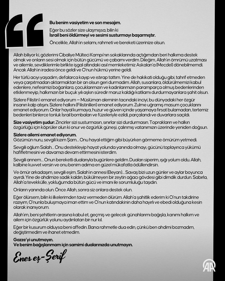 Vasiyetinde, “Eğer bu sözler size ulaştıysa bilin ki, İsrail beni öldürmeyi ve sesimi susturmayı başardı” diyerek sözlerine başlayan eş-Şerif, hayatta kalıp ailesiyle birlikte işgal altındaki memleketi Askalan’a (Mecdel) dönme umudunu taşıdığını, ancak Allah’ın takdirinin tecelli ettiğini belirtiyor.
