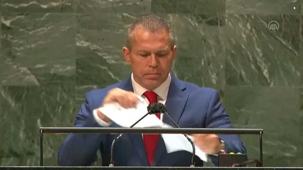 ORtadoğu’daki en büyük terör devleti olan İsrail’in BM Temsilcisi, Siyonist rejimin Filistinlilere yönelik zulüm ve katliamlarını inceleyen BM raporunu genel kurul kürsüsünde yırtıp attı.