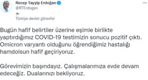 “Omicron varyantı olduğunu öğrendiğimiz hastalığı hamdolsun hafif geçiriyoruz” diye açıklamalarda bulunan Cumhurbaşkanı Erdoğan, çalışmaya evden devam edeceğini ifade ederek, vatandaştan dua istedi.