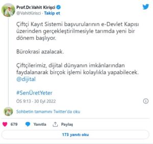Tarım ve Orman Bakanı Vahit Kirişci Twitter hesabından yaptığı açıklamada, “Çiftçi Kayıt Sistemi başvurularının e-Devlet Kapısı üzerinden gerçekleştirilmesiyle tarımda yeni bir dönem başlıyor. Bürokrasi azalacak. Çiftçilerimiz, dijital dünyanın imkânlarından faydalanarak birçok işlemi kolaylıkla yapabilecek. Değişiklik ile; ÇKS başvuruları, e-Devlet Kapısı üzerinden 1 Ekim tarihi itibarıyla hizmete açılıyor. e-Devlet Kapısı hizmetinden, ilk aşamada ürün güncellemesine gidecek çiftçilerimiz yararlanabilecek.