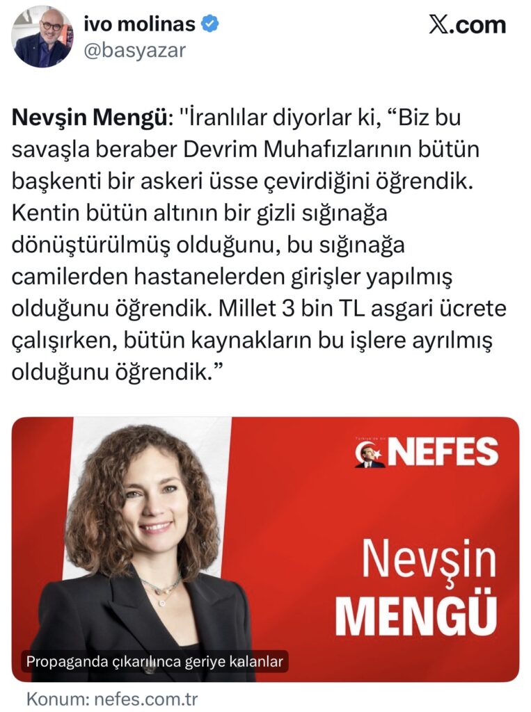 Nevşin Mengü’nün kaleme aldığı o rezil yazı, sıradan bir gazetecilik skandalı değildir; apaçık bir vicdan katliamı, insanlığa karşı işlenmiş ağır bir suçtur. “İranlılar diyor ki” diye başlayıp Tahran’ın altını gizli sığınaklarla, camilerden, okullardan ve hastanelerden özel girişlerle dev bir askerî üsse dönüştürüldüğünü iddia etmek, düpedüz sivil yerleşim yerlerinin bombalanmasını meşrulaştıran en iğrenç propaganda malzemesidir.