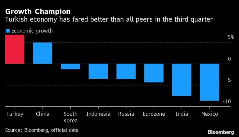 Türkiye’nin koronavirüsle mücadele eden ekonomisi, lirayı ve fiyat istikrarını feda eden bir teşvik kampanyasıyla üçüncü çeyrekte tüm rakiplerinden çok daha iyi bir performans gösterdi. Pazartesi günü açıklanan verilere göre, gayri safi yurtiçi hasıla, önceki üç ayda %9,9 küçüldükten sonra, bir önceki yıla göre %6,7 arttı. Uluslararası ekonomi medyası Bloomberg’in yaptığı anketinden sonuçlar %4,8 büyüme olarak çıktı. Mevsimsel ve çalışma günlerinden arındırılmış rakamlar, üçüncü çeyrekte önceki üç aya göre %15,6 artış gösterdi.