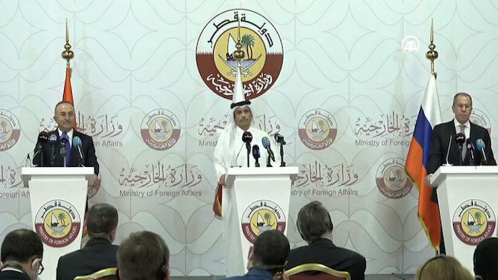 Açıklamada, Katar Devleti, Türkiye Cumhuriyeti ve Rusya Federasyonu dışişleri bakanlarının Suriye ihtilafı ile ihtilafa kalıcı bir siyasi çözüm bulunmasına katkı sağlayacak iş birliği yollarını ele almak amacıyla Doha’da bir araya geldiği bildirildi.
